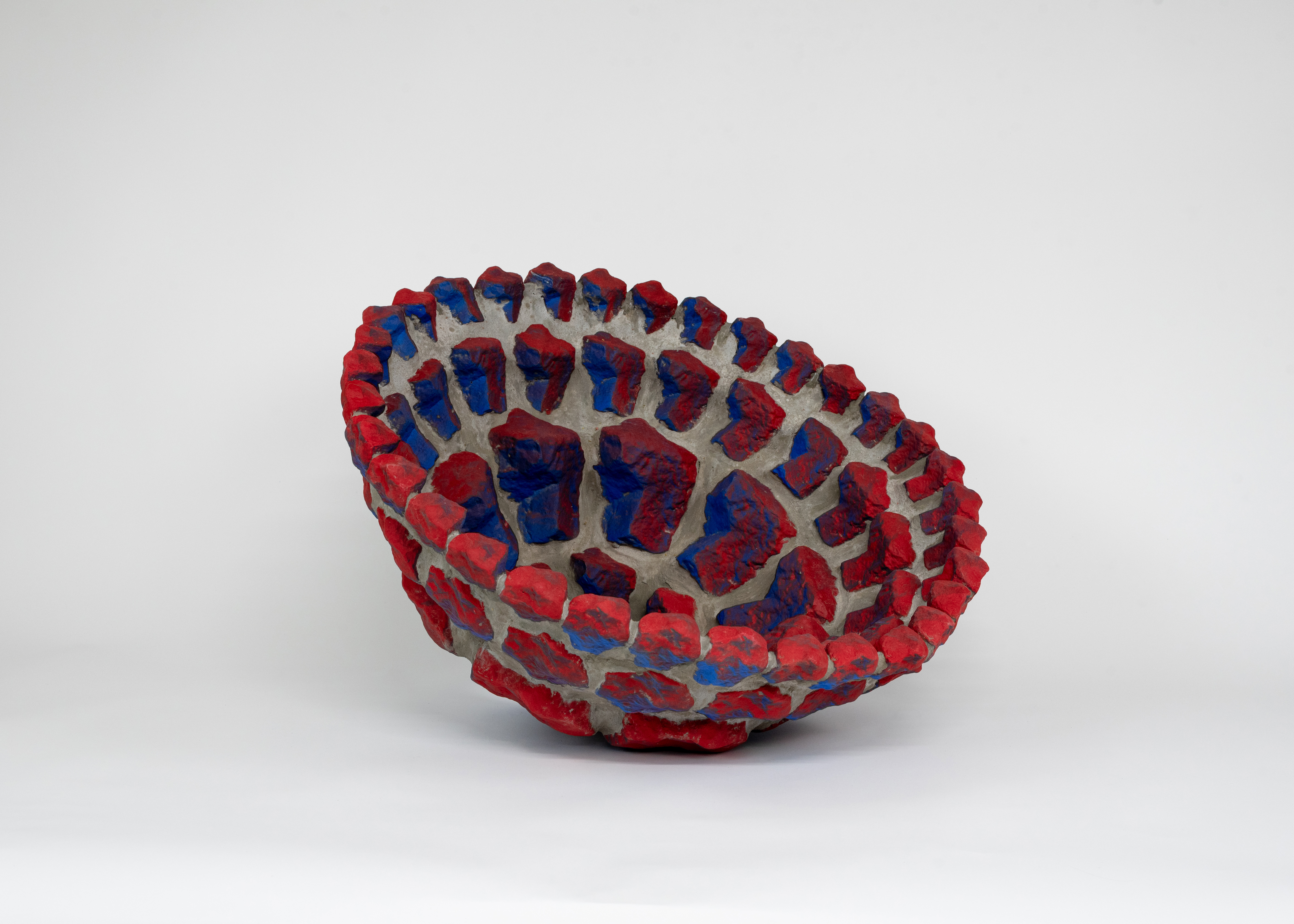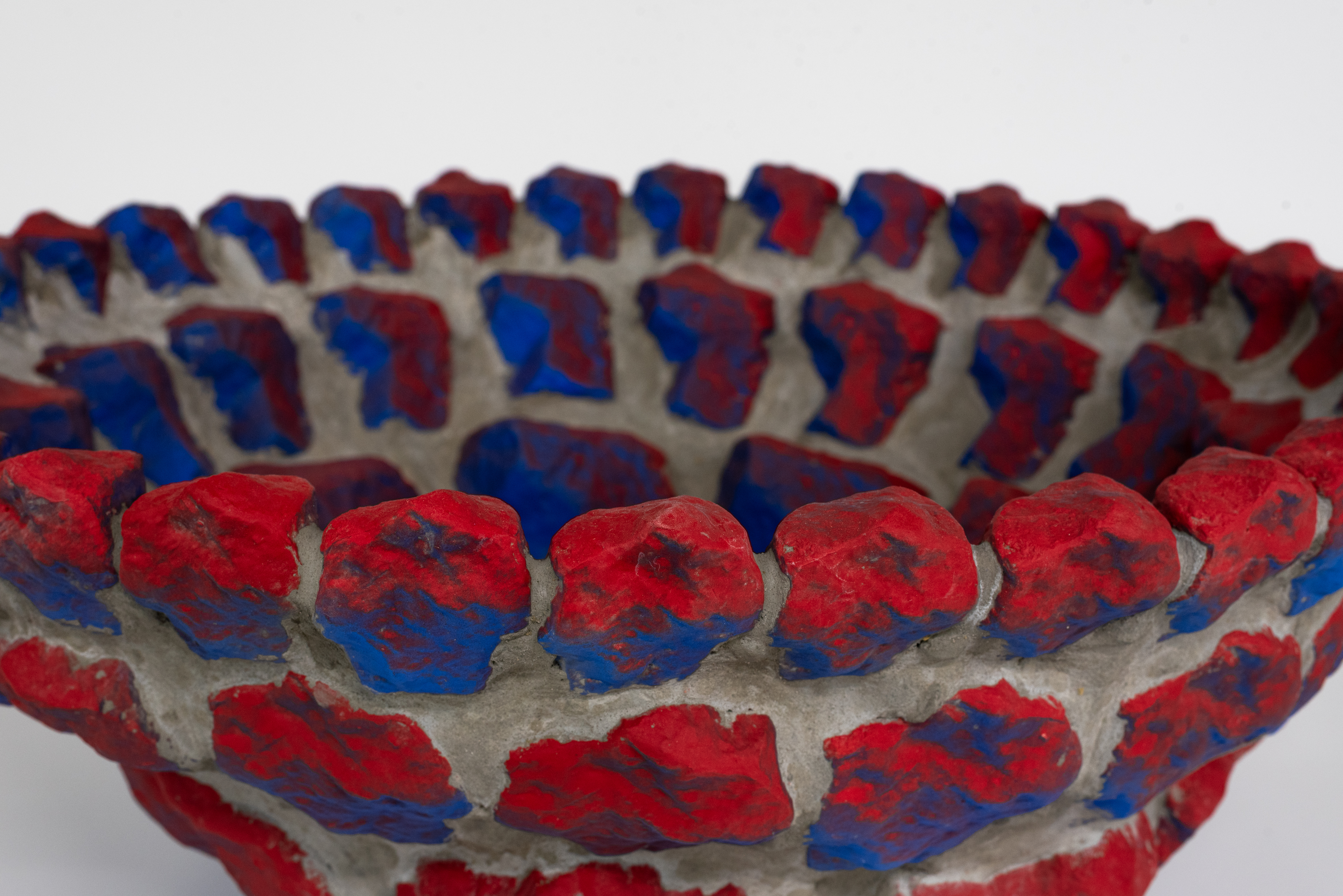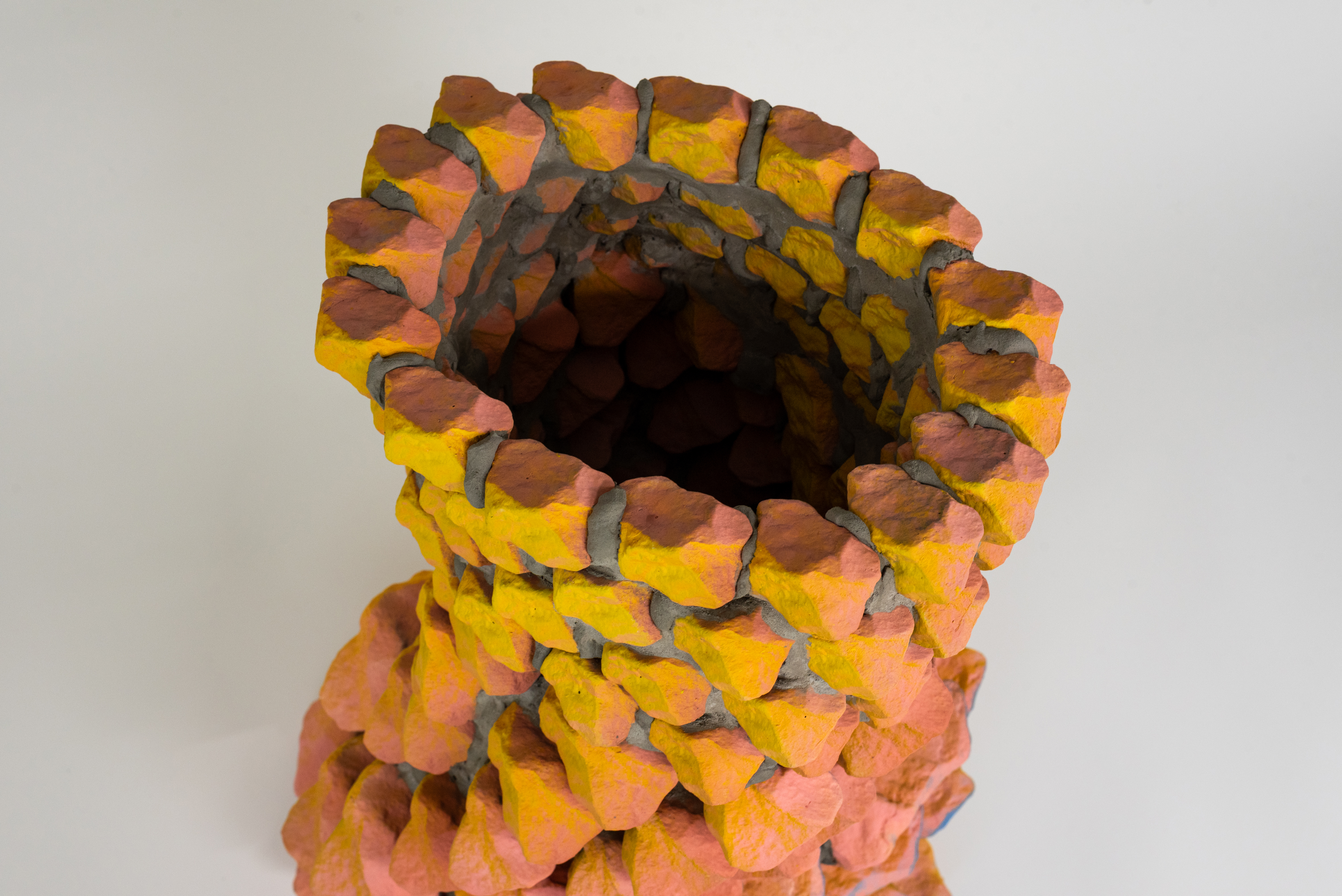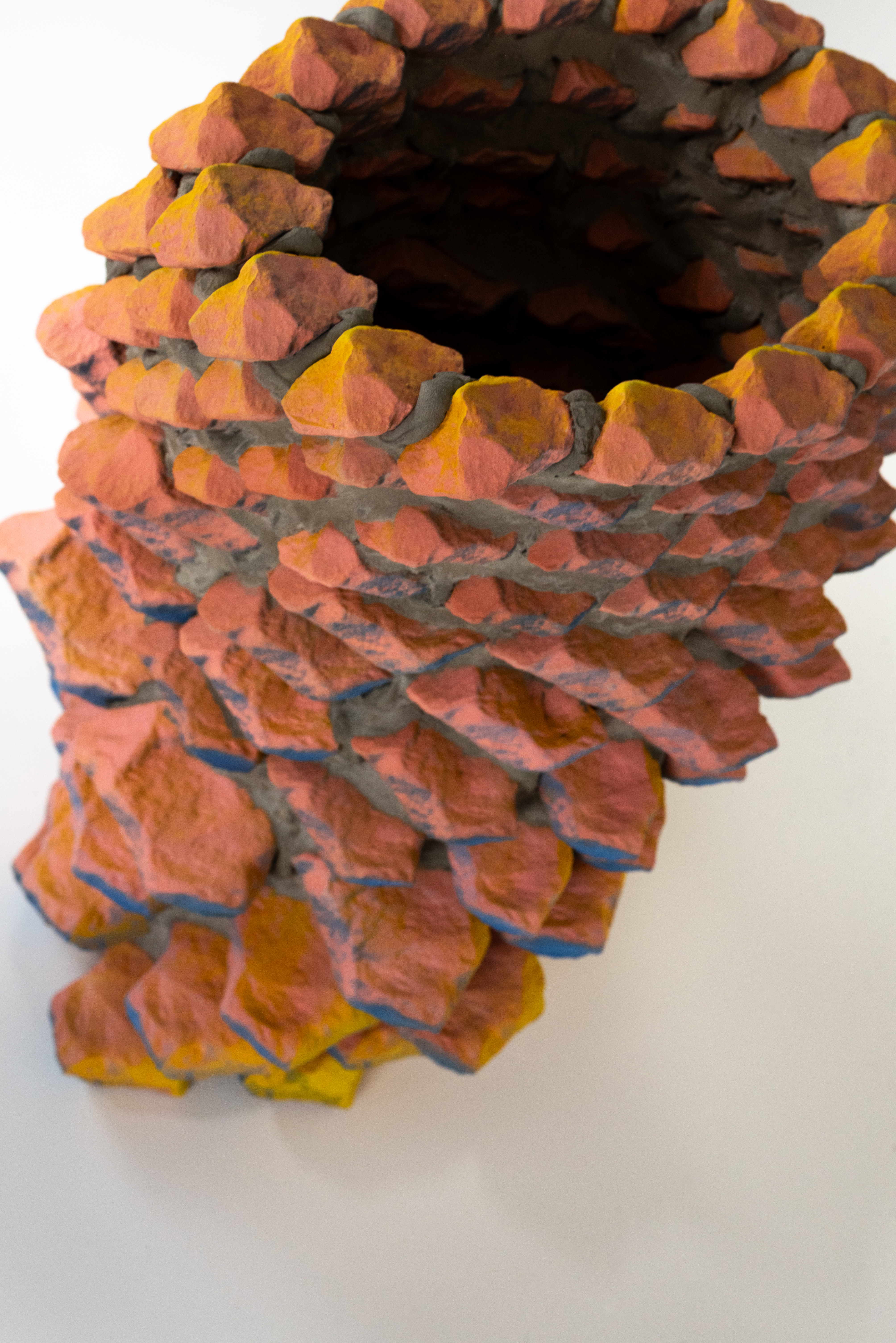 At the core of my work are rocks and minerals, materials with a geological timeline that predates human history. These natural forms, shaped by millennia, serve as both inspiration and raw material. Now, I assess them differently, considering their spatial presence, angles, and potential as digital scans. This multilayered way of looking at simple objects is mirrored in my process: first I scan rocks using photogrammetry or other digital scanning processes, then I bring them into CAD environments to later reinterpret them using 3D printing in clay and plastic. From that, I create molds that allow me to reproduce multiples and experiment with decoration. This repetitive and laborious process challenges assumptions about digital production, often perceived as immediate and opposite from the slow transformations we can witness in nature. Each transformation leaves a trace, a loss of fidelity that becomes part of the object’s new identity. These works hold a dual history: geological and digital. Rather than designing forms from scratch, I’m drawn to the irregularities and subtleties that nature has already carved. Some prints are covered in optical patterns that visually flatten the form, referencing the flatness of working on a screen. Others are repeated, echoing early 2-bit video game graphics, an easy task in software, but painstaking to replicate by hand through casting.